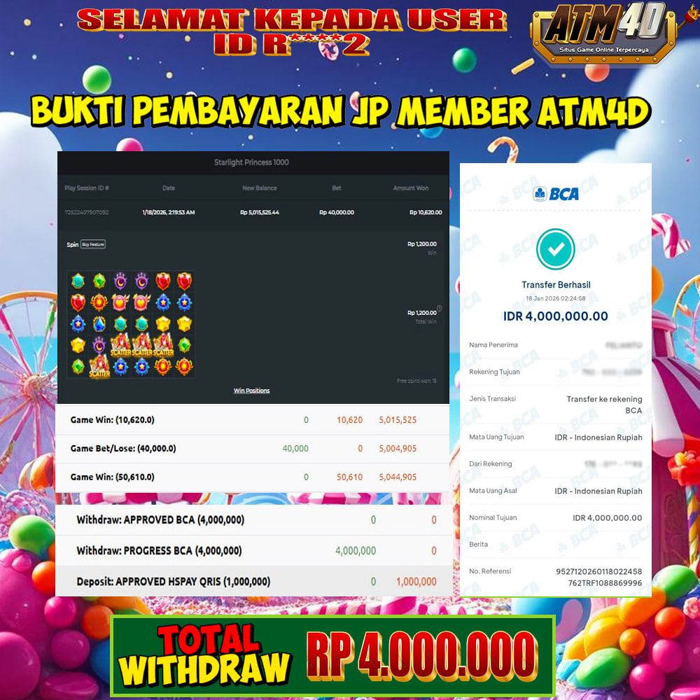 Jangan lewatkan kesempatan untuk meraih kemenangan besar. Daftar sekarang di ATM4D dan rasakan pengalaman bermain slot terbaik yang pernah ada! Putar gulungan, menangkan jackpot, dan jadilah bagian dari komunitas pemain sukses kami!