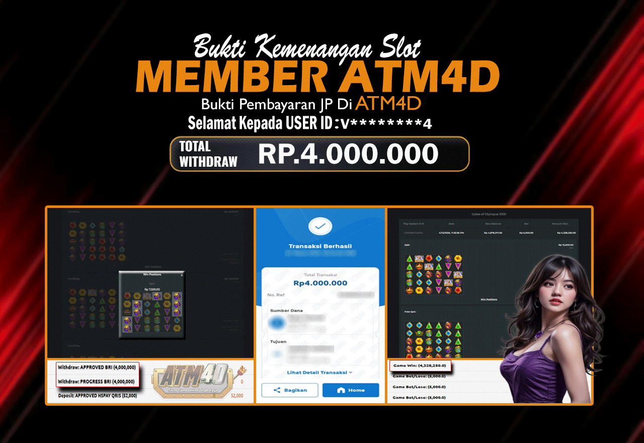 Jangan lewatkan kesempatan untuk meraih kemenangan besar. Daftar sekarang di ATM4D dan rasakan pengalaman bermain slot terbaik yang pernah ada! Putar gulungan, menangkan jackpot, dan jadilah bagian dari komunitas pemain sukses kami!
